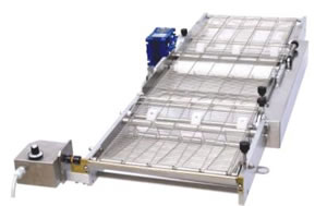 Глазировочный транспортер выполнен из проволочной сетки из нержавеющей стали шириной 250 мм, с отсекателем для удаления излишков шоколада.
